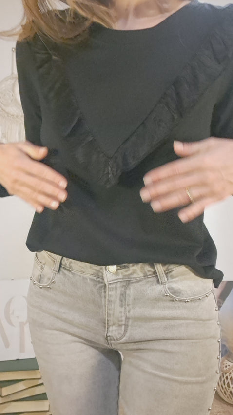 Samarreta bàsica de cotó, negre de coll rodo, però li dona un toc al volant amb V que hi ha al davant i al darrere, i és setinat, que li dona el seu punt, a la bàsica. És molt còmode.